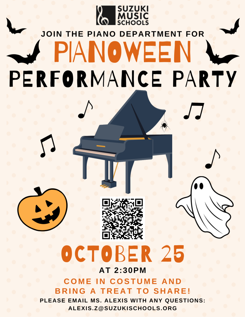 Join the piano students at the transformed Blake Recital Hall for a spook-tacular Pianoween Performance on Saturday, October 25th! The performance starts at 2:30pm and families are asked to donate an item to share that the reception following the performance.